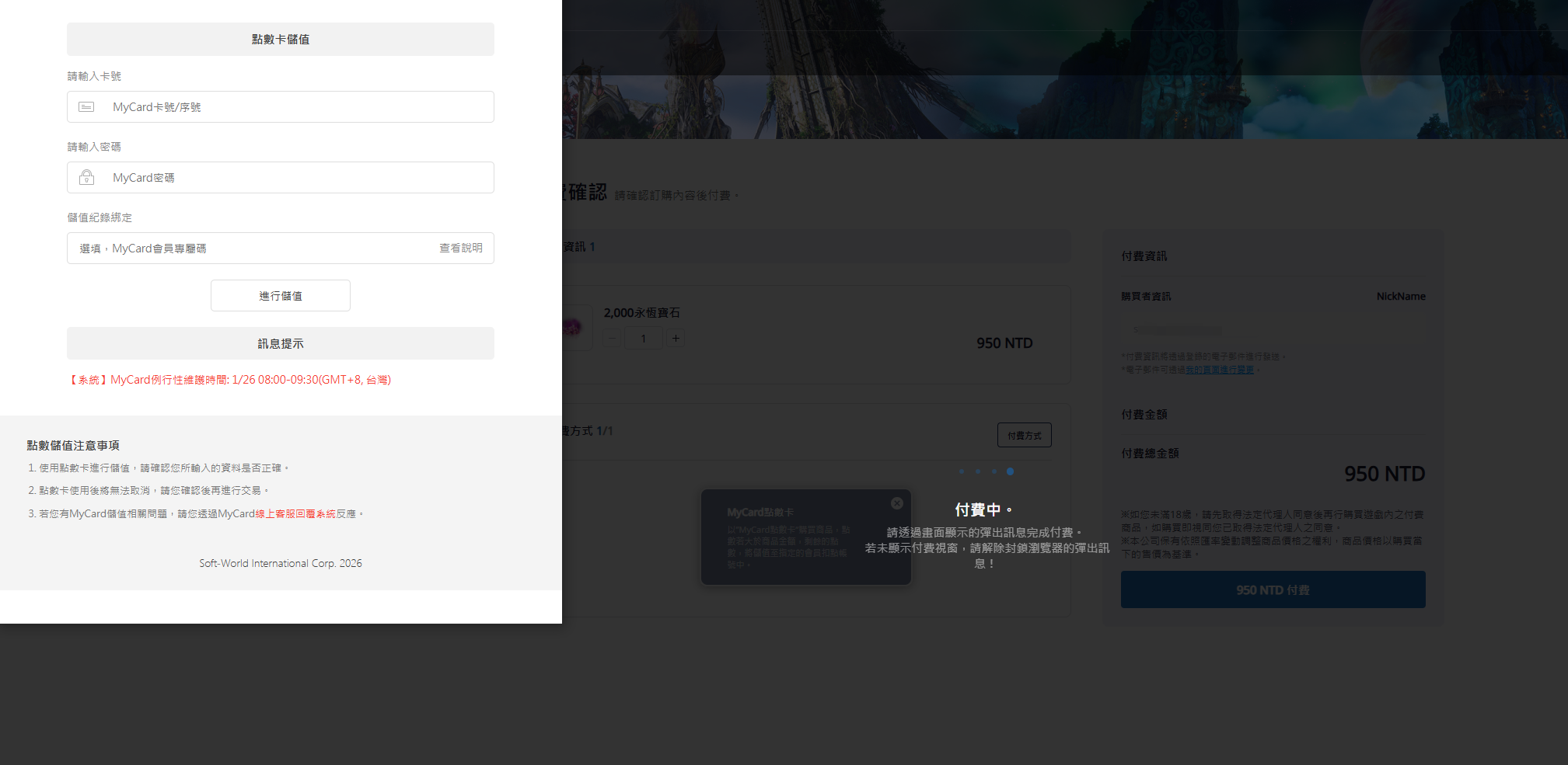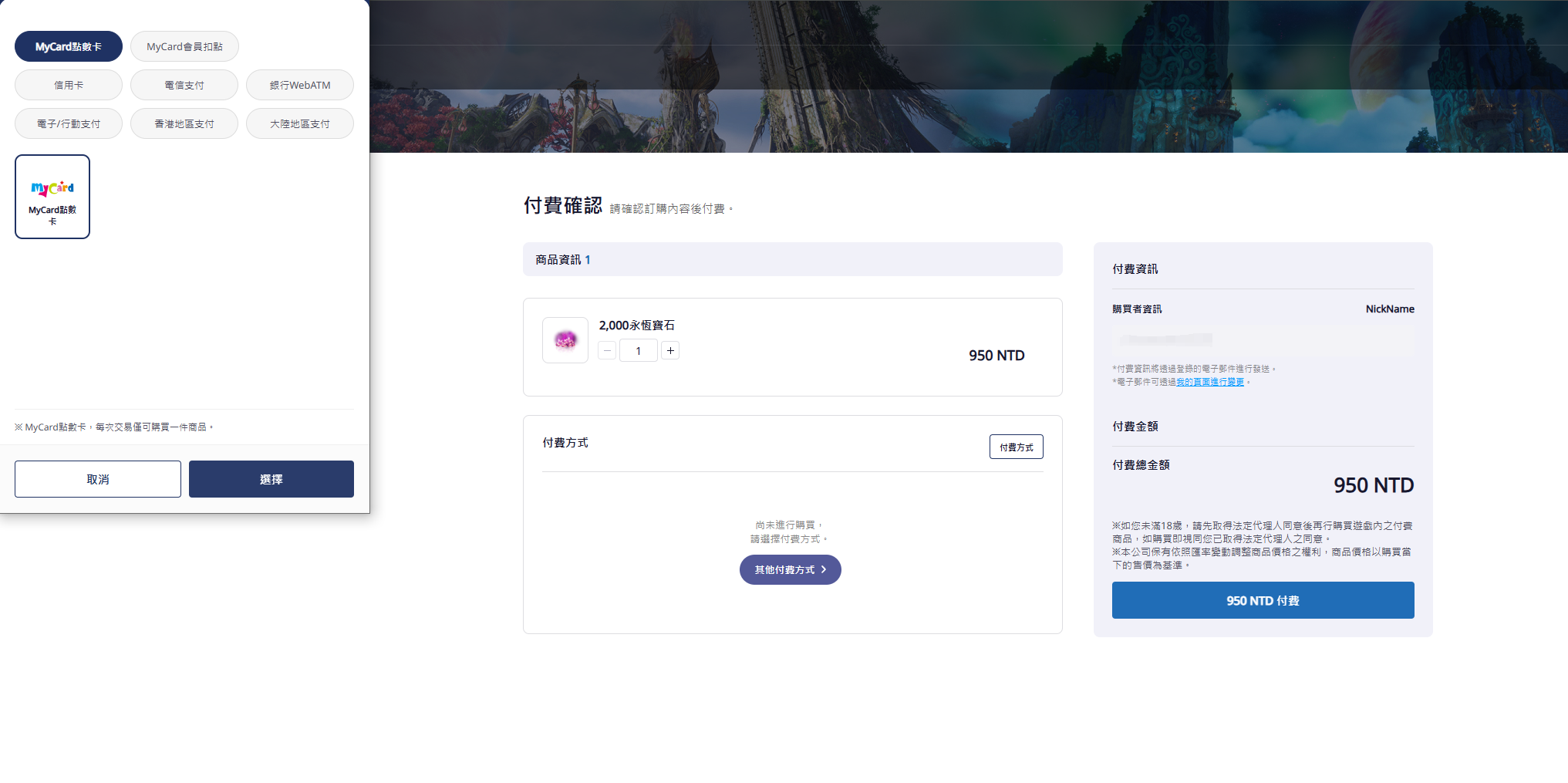 1、选择充值面额,选择付费方式为MYCARD点数卡;